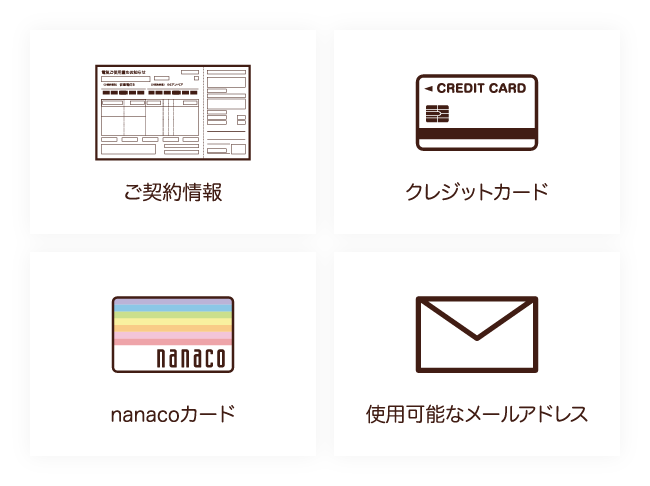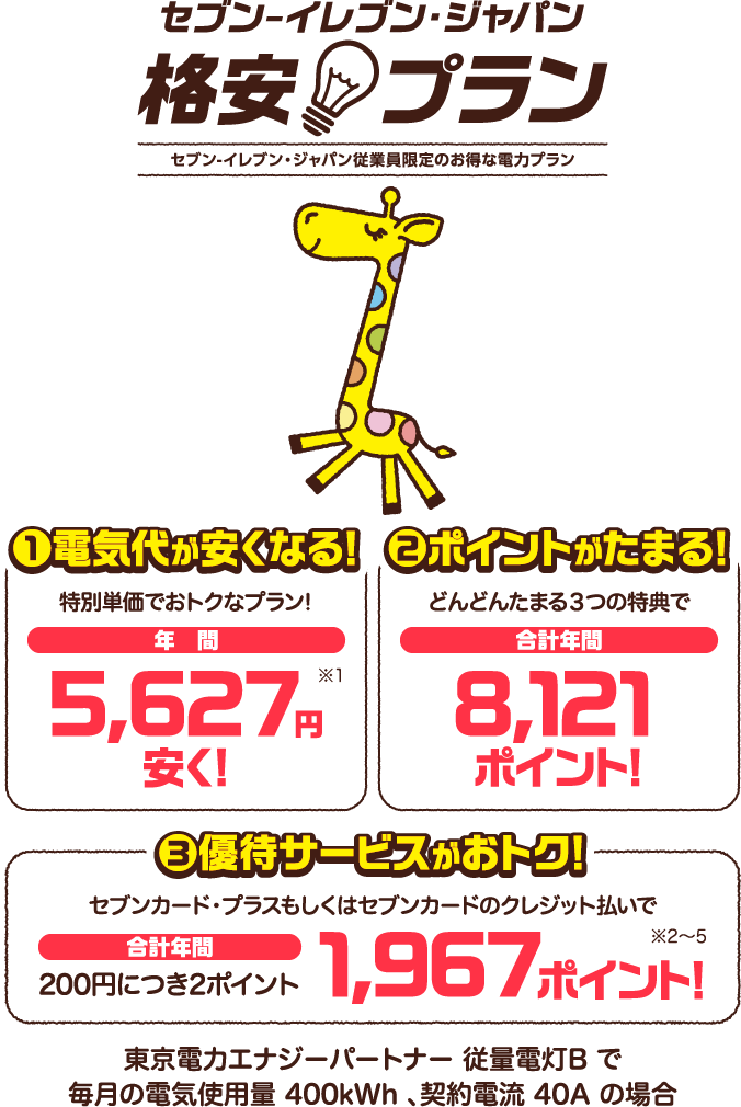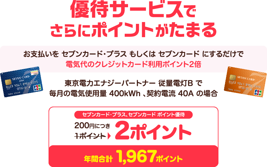 ※1 東京電力エナジーパートナー、従量電灯B、40A、毎月400Kwhの使用を想定して試算した料金のため(燃料費調整額、再生可能エネルギー賦課金は除く)、実際の料金と異なる参考値となります。 ※2 セブンカード・プラスは事前に登録されているnanacoにnanacoポイントを付与します。セブンカードのポイントは本会員様のカードに付与します。 ※3 クレジット払いにより付与されるポイントは、当プランのnanacoポイント付与とは別に、カード発行元である株式会社セブン・カードサービスより付与されます。 ※4 ご利用されたセブンカード・プラス、セブンカードまたはセブンカード・プラスに紐付けているnanacoを退会されている場合や、お支払いを遅延されている場合、カードのご利用を停止されている場合はポイント付与対象となりません。 ※5 掲載内容は予告なく変更となる場合があります。